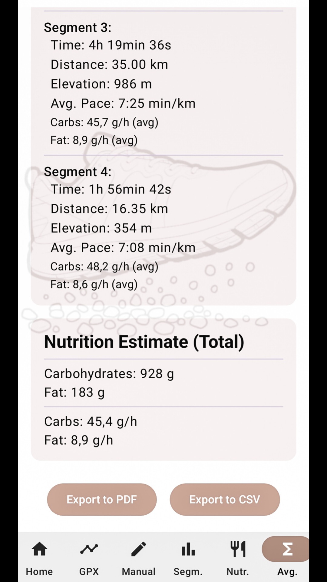 - Export Your Plan All your calculations—total time, average pace, segment splits, elevation gain, and nutrition estimates—are compiled into a clear summary. Save your complete race plan as a PDF or CSV file.