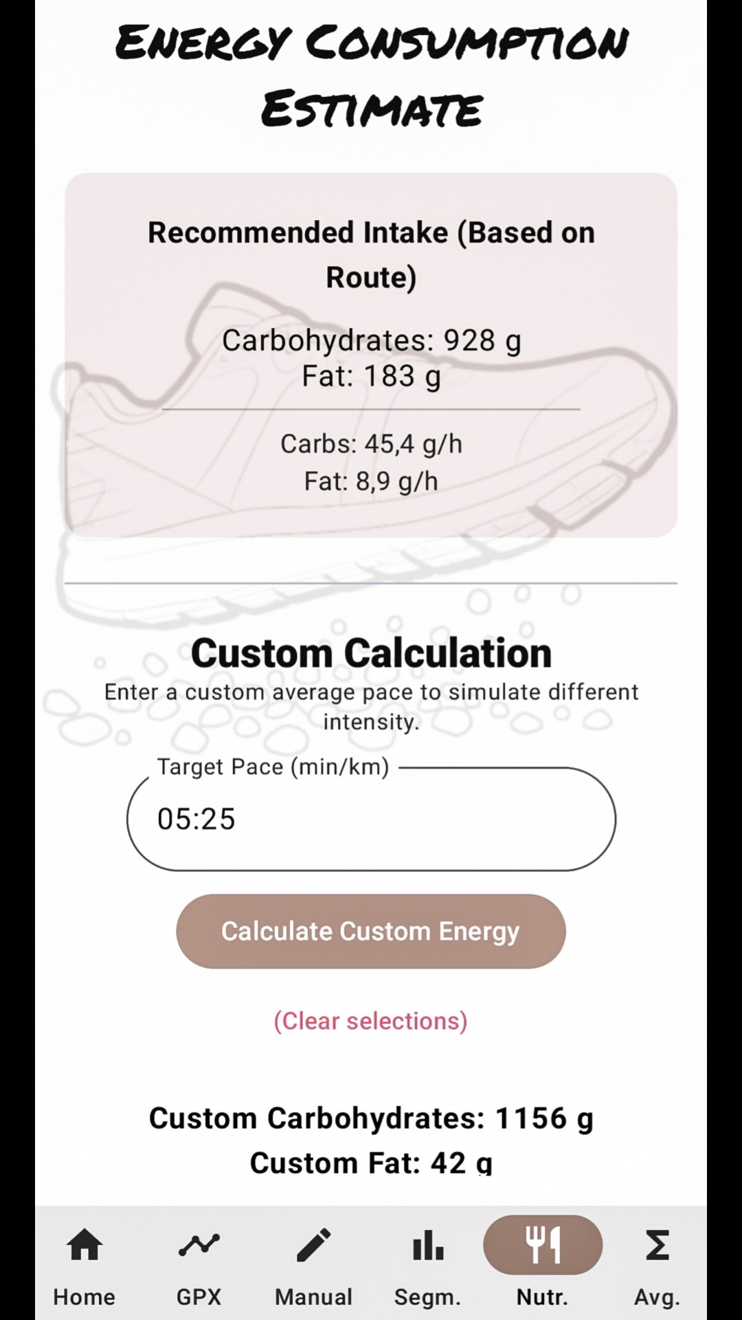 Simply calibrate the app by entering your personal carbohydrate intake (g/h) at two different paces. ApexPace then analyzes your predicted effort over every segment of the route—factoring in hills and fatigue—to estimate your total carbohydrate and fat consumption in grams.